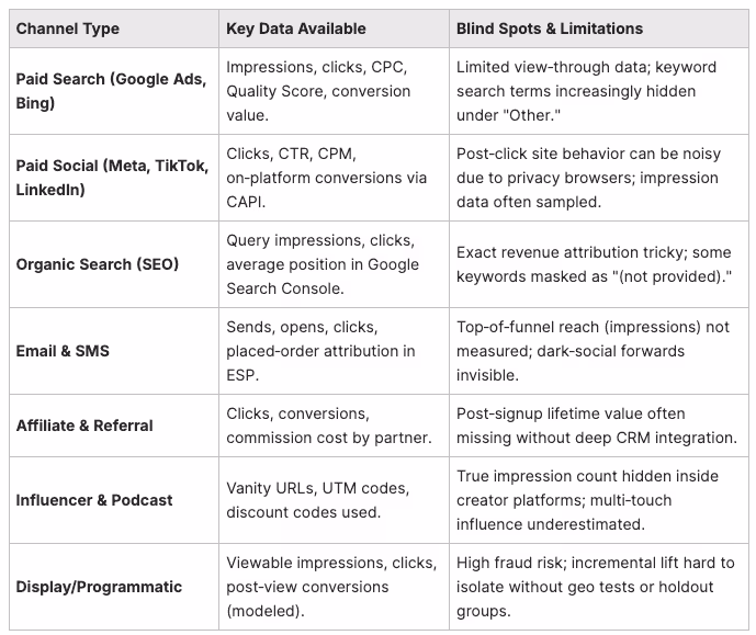 Keep these visibility gaps in mind when setting KPI targets; adjust expectations and weighting so channels are judged by the data they can provide.